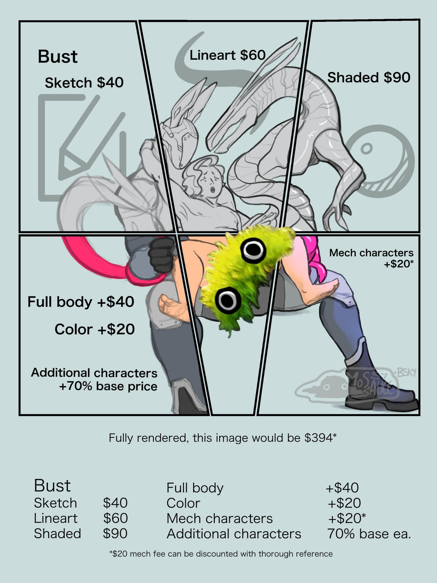| First mechanical character | $90(shaded bust)+$40(full body)+$20(coloring)+$20(mech) | $170 |