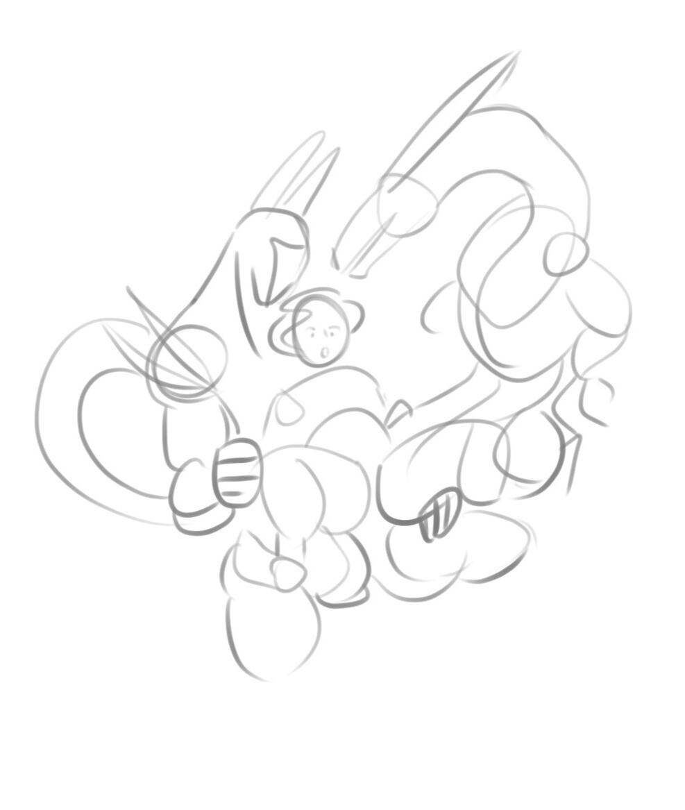 a. Storyboard style sketch: a quick gesture sketch to establish composition and poses.